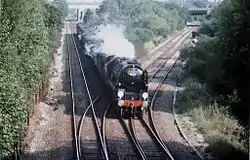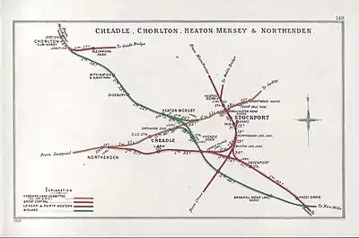 The London and North Western Railway (LNWR) opened its line from Stockport Edgeley, via Cheadle LNW to Northenden on 1 August 1866.[4] Between that date and 1917, the LNWR operated a passenger train service from Stockport (Edgeley) and on to Broadheath and Warrington Arpley, thence to Liverpool Lime street.[5] These trains used the Northenden Line Junction to Cheadle Village Junction curve in Stockport to access the line to Northenden (see adjacent map).