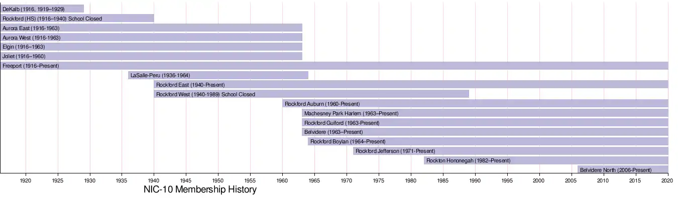 The league became the NIC-9 when Rockford West was closed after the 1988β89 school year, and reverted to NIC-10 when Belvidere North High School opened in 2007. Freeport High School remains the only original member of the conference.
