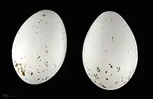 This ibis starts breeding at three to five years of age,[39] and pairs for life.[5] The male chooses a nest site, cleans it, and then advertises for a female by waving his crest and giving low rumbling calls. Once the birds have paired, the bond is reinforced through bowing displays and mutual preening. The nest is a loose construction of twigs lined with grass or straw.[5] G. eremita normally lays two to four rough-surfaced eggs, which weigh an average of 50.16 g (1.769 oz),[40] and are initially blue-white with brown spots, becoming brown during incubation.[5] An egg in the collection of the British Museum was marked more thickly at the broad end, with "spots and very small blotches of yellowish brown and pale rufous". It was 0.93 in long and 0.68 in wide (2.37 × 1.73 cm).[41] The clutch is incubated for 24–25 days to hatching, the chicks fledge in another 40–50 days,[5] and the first flight takes place at about two months.[42] Both parents incubate and feed the chicks.[43]
