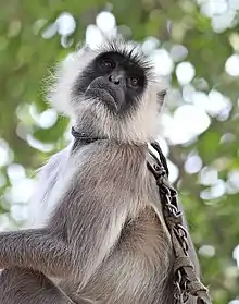 Captive gray langurs are used in Dehli to scare off rhesus macaques, which steal from and sometimes attack people.[8][9]