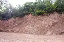 Northfield is built on a well-drained stretch of gravel and sand that had been laid down under a prehistoric shallow sea and enriched by sediments from ice age glaciers. The natural heath land had grown on a flatter area between the nearby Lickey Hills and Redhill. The Northfield area includes a wide geological range of rocks of various ages. The stratigraphic sequence, which is the basis for the area's diversity of landscape and habitat, comprises:[13]