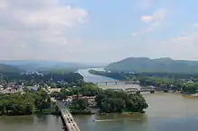 The main river in Northumberland County is the Susquehanna River and the divergence of the 977 miles (1,572 km) long river into its two branches of navigable river and former divisions of the Pennsylvania Canal System. The Susquehanna River's tributaries in the county include the West Branch Susquehanna River, Chillisquaque Creek, Shamokin Creek, and the west flowing Mahanoy Creek, whose valley is a rail and road transportation corridor to Tamaqua and points thereafter either east, north, or south such that: east along rail or US 209 through Nesquehoning and historic Jim Thorpe; else northeast via Beaver Meadows leading north into Hazelton and the lower Wyoming Valley, or into the central Wyoming Valley skirting along the western Poconos via White Haven and Mountain Top; or otherwise head south through the Schuylkill Gap into Port Carbon and thence west to the Lancaster County or east via the greater Reading area into the lower Schuylkill Valley and Philadelphia. The county has mountains in the south and north, with the rest being mostly rolling hills.