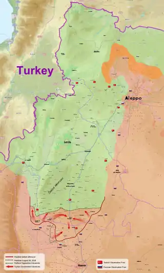 ![]() Situation in Northwestern Syria as of 31 August 2019. Locations of Turkish and Russian outposts are pictured. Syrian Army control Syrian Opposition control Syrian Army & SDF control | |||||||||