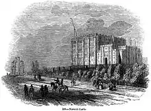 The etcher and watercolourist Edward Thomas Daniell, who was one of the vociferous opponents of the proposed refacing. One of the letters he wrote about the subject appeared in the Norwich Mercury in August 1830, and referred to the "scandalous re-facing of the ancient keep".[19] Although living in London during this period, his letters to his friends the artist Henry Ninham and his friend the botanist Dawson Turner reveal the extent of his opposition. In a letter to Turner, Daniell wrote, "I have had a very beautiful drawing made of it, and I mean to etch it the size of the drawing. I can only say that if my etching be half as much like the castle, or half as good as the drawing, it will be more like, than anything yet done, of that very beautiful relic."[20] To Ninham he wrote, "Show me by a plan, how high they have got pulling down, and enable me to judge whether even now in the eleventh hour, any good can be done; and I in return will just inform you, how I stand with regard to my plate. It stands precisely as it did when I left Norwich."[21] His etching of the old keep, however, was never completed, and the refacing went ahead and was successfully completed.[20]