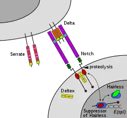 The Notch protein spans the cell membrane, with part of it inside and part outside. Ligand proteins binding to the extracellular domain induce proteolytic cleavage and release of the intracellular domain, which enters the cell nucleus to modify gene expression.[12]