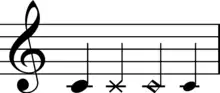 In music, a notehead is the part of a note, usually elliptical in shape, whose placement on the staff indicates the pitch, to which modifications are made that indicate duration. Noteheads may be the same shape but colored completely black or white, indicating the note value (i.e., rhythmic duration). In a whole note, the notehead, shaped differently than shorter notes, is the only component of the note. Shorter note values attach a stem to the notehead, and possibly beams or flags. The longer double whole note can be written with vertical lines surrounding it, two attached noteheads, or a rectangular notehead.[1] An "x" shaped notehead may be used to indicate percussion, percussive effects (ghost notes), or speaking. A square, diamond, or box shaped notehead may be used to indicate a natural or artificial harmonic. A small notehead can be used to indicate a grace note.