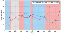The seat is the most economically diverse of the three Nottingham constituencies covering higher income and lower income output areas (sub-divisions of wards).[3] In 2010 it was the most marginal of the seats, changing hands on several occasions over the previous few decades, though is now a very safe Labour seat. There are below-national levels of unemployment claimants, for example at the end of 2010 male claimants were less than half as many as in Nottingham North.[4] The Labour majority has since grown to 6,000 in 2015 and over 15,000 in 2017, making it a safe seat.