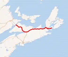 Highway 104 is divided into two distinct sections; the Trans-Canada Highway section which runs from the New Brunswick border to Port Hastings, and a smaller section on Cape Breton Island between Port Hawkesbury and St. Peter's.[2]