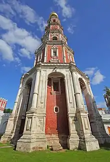 An arresting slender belltower, also commissioned by tsarevna Sofia, was built in six tiers to a height of 72 metres (236 ft), making it the tallest structure in 18th-century Moscow (after the Ivan the Great Bell Tower in the Kremlin). This light octagonal column seems to unite all major elements of the ensemble into one harmonious whole.