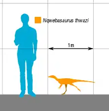 Nqwebasaurus (IPA: [ᵑǃʷɛbaˈsɔɹəs]; anglicized as /ɪŋˌkwɛbəˈsɔːrəs/ or /ˌnwɛbəˈsɔːrəs/[1]) is a basal coelurosaur and is the basal-most member of the coelurosaurian clade Ornithomimosauria from the Early Cretaceous of South Africa.[2] The name Nqwebasaurus is derived from the Xhosa word "Nqweba" which is the local name for the Kirkwood district, and "thwazi" is ancient Xhosa for lightning.[3] Currently it is the only named coelurosaur discovered in Africa and shows that basal coelurosaurian dinosaurs inhabited Gondwana 50 million years earlier than previously thought. The type specimen of Nqwebasaurus was discovered by William J. de Klerk who is affiliated with the Albany Museum in Grahamstown. It is the only fossil of its species found to date and was found in the Kirkwood Formation of the Uitenhage Group. Nqwebasaurus has the unofficial nickname "Kirky", due to being found in the Kirkwood.[2][4][5]