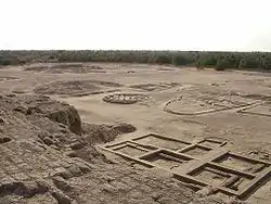 The Eastern Deffufa lies 2 kilometres (1.2 mi) east of the Western Deffufa. The Eastern Deffufa is shorter than the Western Deffufa, just two stories high. It is considered a funerary chapel, being surrounded by 30,000 tumuli or graves. It has two columned halls. The walls are decorated with portraiture of animal in color schemes of red, blue, yellow, and black and stone laid floors. Exterior walls were layered with stone. The third deffufa is of similar structure as the Eastern Deffufa.[5][6]