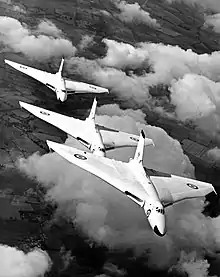 Being so big and heavy, Blue Danube could only be carried by the V bombers, so-called because they all had names starting with a "V".[97] The three strategic bombers, known collectively as the V class, comprised the United Kingdom's strategic nuclear strike force during the 1950s and 1960s, which was known as V force of the Main Force.[98][99] The three V bombers were the Vickers Valiant, which entered service in February 1955;[100] the Avro Vulcan, which entered service in May 1956; and the Handley Page Victor, which entered service in November 1957.[101] The V Bomber force reached its peak in June 1964, when 50 Valiants, 70 Vulcans and 39 Victors were in service.[102]