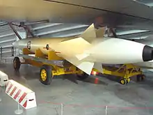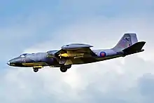 Four squadrons of English Electric Canberra bombers based in Germany were equipped with US Mark 7 nuclear bombs stored at RAF Germany bases. There were also four squadrons of nuclear-armed Canberras based in the UK, which were capable of carrying either the Mark 7 or Red Beard. They too were assigned to the SACEUR in October 1960.[182] The planned V-bomber force was reduced to 144 aircraft, and it was intended to equip half of them with Project E weapons,[183] so 72 Mark 5 nuclear bombs were supplied for the V-bombers.[184][185] When the MDA came into force, the US agreed to supply the V-bombers with megaton weapons in place of the Mark 5,[186] in the form of Mark 15 and Mark 39 nuclear bombs.[184]