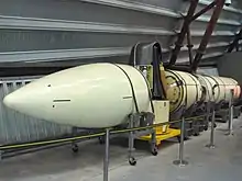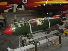 This led to the development of the first deployed weapon, the Blue Danube free-fall bomb. It had a 60-inch (1,500 mm) diameter, 32 explosive lens implosion system with a levitated pit suspended within a natural uranium tamper.[89] The warhead was contained within a bomb casing measuring 62 inches (1,600 mm) diameter and 24 feet (7.3 m) long, and it weighed approximately 4.5 tonnes (4.4 long tons), of which about 2.5 tonnes (2.5 long tons) was high explosive.[90] The first Blue Danube bombs were delivered to the Royal Air Force (RAF) Bomber Command in November 1953,[91] although the bombers to deliver them did not become available until 1955.[92][93]