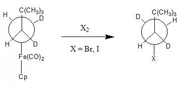 While nucleophilic abstraction of an alkyl group is relatively uncommon, there are examples of this type of reaction. In order for this reaction to be favorable, the metal must first be oxidized because reduced metals are often poor leaving groups. The oxidation of the metal causes the M-C bond to weaken, which allows for the nucleophilic abstraction to occur. G.M. Whitesides and D.J. Boschetto use the halogens Br2 and I2 as M-C cleaving agents in the following example of nucleophilic abstraction.[3]