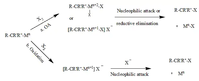 In path a, the first step proceeds with the oxidative addition of the halogen to the metal complex. This step results in the oxidized metal center that is needed to weaken the M-C bond. The second step can proceed with either the nucleophilic attack of the halide ion on the α-carbon of the alkyl group or reductive elimination, both of which result in the inversion of stereochemistry. In path b, the metal is first oxidized without the addition of the halide. The second step occurs with a nucleophilic attack of the α-carbon which again results in the inversion of stereochemistry.