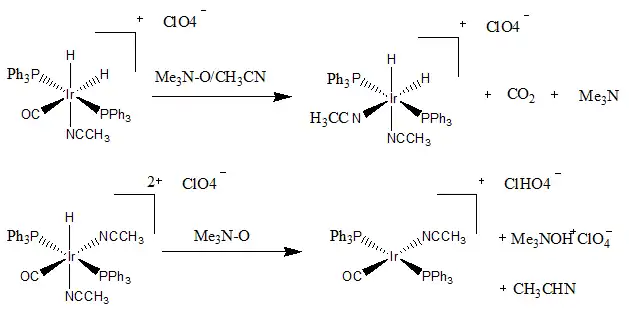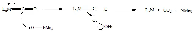 Trimethylamine N-oxide (Me3NO) can be used in the nucleophilic abstraction of carbonyl. There is an nucleophilic attack of Me3NO on the carbon of the carbonyl group which pushes electrons on the metal. The reaction then proceeds to kick out CO2 and NMe3.[4][5]