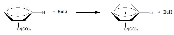 Nucleophilic abstraction can occur on a ligand of a metal if the conditions are right. For instance the following example shows the nucleophilic abstraction of H+ from an arene ligand attached to chromium. The electron withdrawing nature of the chromium allows for the reaction to occur as a facile reaction.[1]
