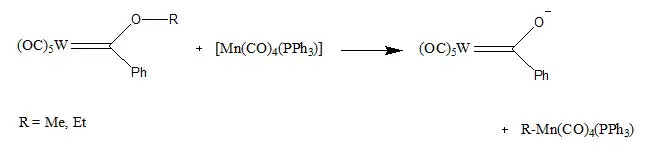 A Fischer carbene can undergo nucleophilic abstraction where a methyl group is removed. With the addition of a small abstracting agent, the abstracting agent would normally add to the carbene carbon. In this case however, the steric bulk of the abstracting agent that is added causes the abstraction of the methyl group. If the methyl group is replaced with ethyl, the reaction proceeds 70 times slower which is to be expected with a SN2 displacement mechanism.[7]