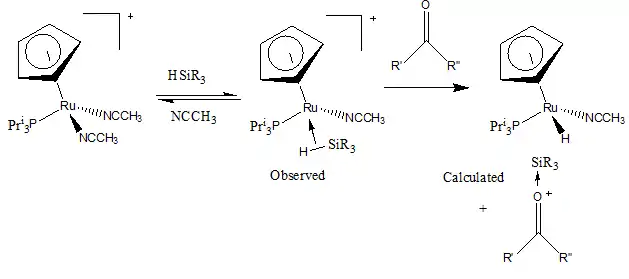 In the first step of this mechanism one of the acetonitrile groups is replaced by a silicon molecule where the bond between the silicon and the hydrogen is coordinating to the ruthenium. In the second step a ketone is added for the nucleophilic abstraction of the silylium ion and the hydrogen is left on the metal.