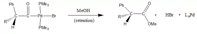 One example of nucleophilic abstraction of an α-acyl group is seen when MeOH is added to the following palladium complex. The mechanism follows a tetrahedral intermediate which results in the methyl ester and the reduced palladium complex shown.[9]