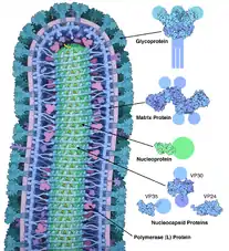 Virus genomes (either DNA or RNA) are extremely tightly packed into the viral capsid.[4][5] Many viruses are therefore little more than an organised collection of nucleoproteins with their binding sites pointing inwards. Structurally characterised viral nucleoproteins include influenza,[6] rabies,[7] Ebola, Bunyamwera,[8] Schmallenberg,[8] Hazara,[9] Crimean-Congo hemorrhagic fever,[10] and Lassa.[11]