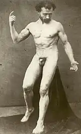 The emphasis of fine arts is aesthetics and creativity; and any erotic interest, although often present, is secondary.[4] This distinguishes nude photography from both glamour photography and pornographic photography. The distinction between these is not always clear, and photographers tends to use their own judgment in characterizing their own work,[5][6][7] though viewers also have their judgement. The nude remains a controversial subject in all media, but more so with photography due to its inherent realism.[8] The male nude has been less common than the female, and more rarely exhibited.[9][10]