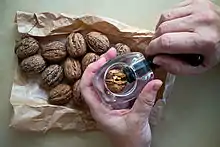 Nuts were historically opened using a hammer and anvil, often made of stone.[1] Some nuts such as walnuts can also be opened by hand, by holding the nut in the palm of the hand and applying pressure with the other palm or thumb, or using another nut.[2]