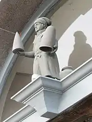 The building is four storeys tall and five bays wide. It has a red tile roof with four dormers. Above the gate is a figure of a sugar-baker holding a sugarloaf in one hand and a sugar tin in the other. The figure dates from Römer's sugar refinery. It served as a means of identifications at a time when house numbers had not yet been introduced. Many other houses along the Nyhavn quay feature similar signs.