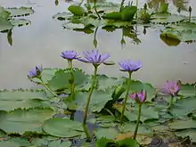 Nymphaea nouchali, often known by its synonym Nymphaea stellata, or by common names blue lotus,[1] star lotus, red and blue water lily, blue star water lily or manel flower is a water lily of genus Nymphaea. It is native to southern and eastern parts of Asia, and is the national flower of Bangladesh and Sri Lanka. In Sanscrit it is utpala. This species is sometimes considered to include the blue Egyptian lotus Nymphaea caerulea.[2] In the past, taxonomic confusion has occurred, with the name Nymphaea nouchali incorrectly applied to Nymphaea pubescens.[3]