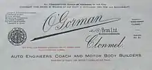 John F.O'Gorman completed his learning in London and was appointed by the Department of Agricultural and Technical Instruction, to teach the Theory of Road Carriage Building. He first traded as O'Gorman Bros, Address: 12 Wellington Street, Clonmel.[1] and advertised 'Motor Bodies of every description built on the premises'. They were special Agents for Austin, Humber and Ford cars. Shortly after the First World War, John F. O'Gorman went to Germany and captured the first main dealership in Ireland for Mercedes-Benz cars.