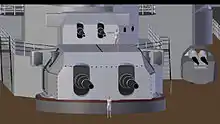 The ships' main armament batteries were to have consisted of six 38.1 cm (15.0 in) L/47 SK C/34 quick-firing guns mounted in three twin turrets, the same Drh LC/38 gun turrets as were used on the Bismarck-class battleships.[10] Two of the turrets were mounted in a superfiring pair forward, with the third turret placed aft of the main superstructure. The guns could depress to −8 degrees and elevate to 35 degrees. At maximum elevation, the guns could hit targets 36,200 m (39,600 yd) away. The guns had a designed supply of 630 shells, for a total of 105 rounds per gun.[6] There were three types of shells: capped armor-penetrating, and two different high-explosive shells; all three shells weighed 800 kg (1,800 lb). The guns used a 99.5 kg (219 lb) fore charge and a 112.5 kg (248 lb) main charge in a brass case. This provided a muzzle velocity of 820 meters per second (2,690 feet per second).[10]