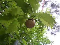 Traditional celebrations to commemorate the event often entailed the wearing of oak apples (a type of plant gall, possibly known in some parts of the country as a "shick-shack") or sprigs of oak leaves, in reference to the occasion after the Battle of Worcester in September 1651, when Charles II escaped the Roundhead army by hiding in an oak tree near Boscobel House.[6] Anyone who failed to wear a sprig of oak risked being pelted with bird's eggs or thrashed with nettles.[7] In Sussex, those not wearing oak were liable to be pinched, giving rise to the unofficial name of "Pinch-bum Day"; similarly it was known as "Bumping Day" in Essex.[8]