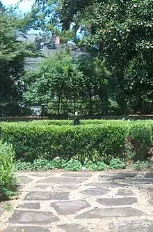 A Bridal Walk is located near the carriage house with a small "chapel" building beside it. It was introduced in the early 1900s for Berry newlyweds, who were invited by Martha Berry, after their wedding ceremony, to walk down to the summerhouse at the end of the walk and make their first wish at that location. Weddings were not commonplace at Oak Hill because of a private residence, but Martha urged Berry alumni and students to use the chapels on Berry College campus. The boxwoods at each trellis and roses growing over the trellis' with mondo grass on the outside of the curbing. A perennial border on the east side of the walk, utilizing peonies which were given by Clara Ford and ornamental grasses, eucalyptus, and many other flowering shrubs and perennials.[11]