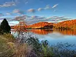 The earliest substantial occupation of the Oak Ridge area occurred during the Woodland period (c. 1000 BC – 1000), although artifacts dating to the Paleo-Indian period have been found throughout the Clinch Valley.[11] Two Woodland mound sites—the Crawford Farm Mounds and the Freels Farm Mounds—were uncovered in the 1930s as part of the Norris Basin salvage excavations. Both sites were just southeast of the former Scarboro community.[12] The Bull Bluff site, which was occupied during the Woodland and Mississippian (c. 1000–1600) periods, was uncovered in the 1960s in anticipation of the construction of Melton Hill Dam.[13] Bull Bluff is a cliff immediately southeast of Haw Ridge, opposite Melton Hill Park. The Oak Ridge area was largely uninhabited when Euro-American explorers and settlers arrived in the late 18th century, although the Cherokee claimed the land as part of their hunting grounds.
