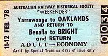 During World War II, additional sidings of both Victorian broad gauge and NSW standard gauge were provided, to serve Australian defence installations which were located at Oaklands. There was no passenger service to Oaklands at first but, in December 1946, a twice-weekly service began, operated by a rail motor.[2] That service had been discontinued by the early 1950s.[3]
