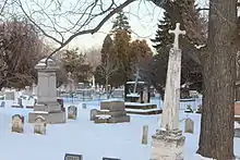 Oakwood Cemetery in Niagara Falls, New York was founded in 1852 after land was donated by Lavinia Porter. It covers over 18 acres (1 km²) and over 19,000 are buried there. Notable graves include first person to survive going over Niagara Falls in a barrel Annie Edson Taylor, Judge Augustus Porter, and first person to swim the English Channel Captain Matthew Webb.[1] In 2014 it was listed on the National Register of Historic Places.[2]