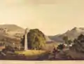 Over the course of time, many of these stelae fell over[3] due to several reasons: structural collapse (as, probably, in the case of the Great Stele, measuring 33 m), possibly immediately after their erection; earthquakes (Axum is in a seismic zone); or the military incursions of the Imam Ahmad Gragn during the Ethiopian-Adal War from 1529 to 1543. In the 19th century, of the three major "royal" stelae, only King Ezana's Stele remained erect, shown in the print "The Obelis of Axum" of Henry Salt (1780–1827).[4] Salt travelled back to England with Captain Thomas Fremantle, and the design of the Obelisk of Axum influenced that of the Nelson Monument, Portsdown Hill, for which Fremantle raised the funds.[5]