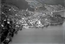 In 1864 a fire destroyed part of the town, but opened up land for new developments. In the following decade the municipality grew into a health spa destination and in 1875 the Logierhaus Moy (Moy Hotel) opened. It was followed by several other hotels, resorts and spas over the following decades. The Seestrasse, a road along the lake, was completed in 1884 and helped bring tourists to the town. The Seestrasse was followed by the Steffisburg-Thun tram in 1913 which made visiting Oberhofen even easier. However, the outbreak of World War I devastated the tourist industry. In the interwar period, tourism returned slightly but not to the levels that it had seen before the war. A new dock was built in the lake for tour boats, but other new construction remained limited. Tourism slumped again with the outbreak of World War II and did not recover until 1950. Beginning in the 1950 many new vacation homes and a beach promenade were built to bring tourists back to the municipality. A regional indoor pool opened in Oberhofen in 1970. Today, a number of small businesses operate in the municipality, but about two-thirds of the labor force commutes to jobs in cities like Thun and Bern.[3]