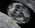 ![]() Obstetric sonogram of a fetus at 16 weeks. The bright white circle center-right is the head, which faces to the left. Features include the forehead at 10 o'clock, the left ear toward the center at 7 o'clock and the right hand covering the eyes at 9:00. | |