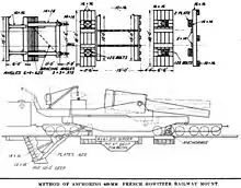 The railway carriage for the howitzers was called the affut à Berceau Saint-Chamond and was used on a number of different railroad guns. The howitzers were mounted on rectangular steel bases, which were suspended on two railroad bogies. The rear bogie had four axles, while the front bogie had six axles.[6] The number of axles was determined by the weight limit for European railways of 17 tonnes per axle and 17x10 = 170 tonnes.[1] Since the barrels were naval guns that were not intended for use at high angles of elevation the trunnions were relocated relatively far forward and the howitzers were nose heavy which is why the front bogie had more axles than the rear.[6]