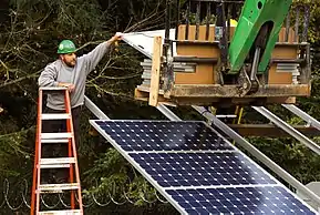 Installation effectively combines three high risk industries in one: roofing, carpentry, and electrical work.[2] There is a risk of electrocution from installation or nearby power lines,[10] as well as ergonomic risks from heavy loads or a lack of lifting equipment. Cold or heat stress and sun exposure can also occur.[11]