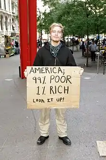 OWS's goals included a reduction in the influence of corporations on politics,[60] more balanced distribution of income,[60] more and better jobs,[60] bank reform[41] (especially to curtail speculative trading by banks[61]), forgiveness of student loan debt[60][62] or other relief for indebted students,[63][64] and alleviation of the foreclosure situation.[65] Some media labeled the protests "anti-capitalist",[66] while others disputed the relevance of this label.[67] Nicholas Kristof of The New York Times noted "while alarmists seem to think that the movement is a 'mob' trying to overthrow capitalism, one can make a case that, on the contrary, it highlights the need to restore basic capitalist principles like accountability".[68] Rolling Stone writer Matt Taibbi asserted, "These people aren't protesting money. They're not protesting banking. They're protesting corruption on Wall Street."[69] In contradiction to such views, academic Slavoj Zizek wrote, "capitalism is now clearly re-emerging as the name of the problem,"[70] and Forbes columnist Heather Struck wrote, "In downtown New York, where protests fomented, capitalism is held accountable for the dire conditions that a majority of Americans face amid high unemployment and a credit collapse that has ruined the housing market and tightened lending among banks."[71]