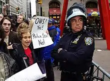 In September, sympathetic coverage given to the movement by the media was substantially increased after the circulation of a video of pepper spray being used by a police commander against peaceful female protestors.[103] In early October, Naomi Klein congratulated New York occupiers for their commitment to nonviolence.[108] By November 2011, media sources began to report an increase in violence, with allegations of sexual assault and incidents of violence from occupiers against the police, including one officer allegedly stabbed with scissors.[103][109][110] Some occupy camps responded by requiring that all occupiers sign a resolution to be nonviolent if they wished to stay.[104] Rick Hampton for USA Today said the vast majority of occupy members have been nonviolent.[103] Reviewing the global movement in December 2011, Anthony Barnett said its nonviolence remained an immense strength.[34] In late January 2012, the movement's commitment to nonviolence was questioned after clashes with the police that saw about 400 arrests in the U.S. city of Oakland. Some protestors and witnesses said the police initiated the violence; others said there was violence against the police; however, they blamed agents provocateurs. One protester who did not take part stated, "It was organized by a very militant anarchist segment of the movement; I support the idea of taking a building, especially for housing those who don't have housing. But I don't support it with the kind of triumphal attitude I saw expressed."[107][111][112]