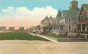 The main institutional buildings in Ocean Park were mainly constructed in the 1880s in a Classical Revival style. The site was home to a large Free Will Baptist meeting site, organized in 1881 largely by Bates College President Oren B. Cheney. One of the prominent buildings is the Free Baptist Tabernacle Temple, a large octagonal meeting hall serving as the central gathering place of the camp. The style was similar to other prominent summer church camp meetings such those at Ocean Grove, New Jersey and Wesleyan Grove on Martha's Vineyard.[1]