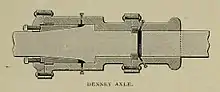 To prevent excessive friction and wear on the wheels Denney's divided axles were used, which permitted the wheels to rotate independently of each other. The coupling was of gun metal, in three pieces, which were riveted together after the brasses were in place. The portion of the coupling shown at the right in the cut was shrunk into that half of the axle. The collar at the extreme end of the coned portion of the axle was also shrunk on. A long conical bearing with adjustable brasses was provided as shown. The joints of the coupling were tight so that it could be filled with oil. With this axle little trouble was experienced from the sharp curves.[1][2]
