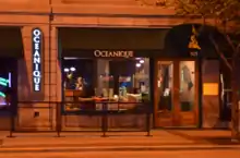 Oceanique is a fine dining gourmet French-American cuisine restaurant with a specialty and focus on seafood in Evanston, Illinois. Oceanique has consistently been ranked as the number one seafood restaurant in the Chicago metro area by the Zagat Guide. "Make It Better Magazine" deemed it the best fine dining restaurant in the 2014 Best of the North Shore.[1] It opened in 1989 and has been in business for a total of 25 years. Mark Grosz is the head chef as well as the owner of the establishment. It is located on 505 Main Street two blocks away from the Main St. 'L' Station. Oceanique has an adjoining outdoor patio that customers can use, weather permitting.[1][2] [3] [4] [5] [6] [7] [8] [9] [10] [11] [12] [13] [14] [15] [16] [17]