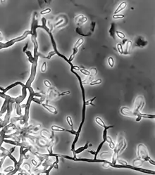 Ochroconis gallopava, also called Dactylaria gallopava or Dactylaria constricta var. gallopava, is a member of genus Dactylaria. Ochroconis gallopava is a thermotolerant, darkly pigmented fungus that causes various infections in fowls, turkeys, poults, and immunocompromised humans[1][2][3][4] first reported in 1986.[2] Since then, the fungus has been increasingly reported as an agent of human disease[2] especially in recipients of solid organ transplants (e.g., liver, kidney, heart, and lung).[1][2][3][4] Ochroconis gallopava infection has a long onset and can involve a variety of body sites.[5] Treatment of infection often involves a combination of antifungal drug therapy and surgical excision.