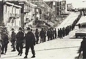 The two named Canadian Forces operations were Operation Ginger to mount guards on the Government of Canada buildings and important residences outside of Quebec, and Operation Essay to provide aid to the civil power in Quebec.[24] The Royal 22e Régiment, more commonly known as the "Van Doos", the most famous French-Canadian regiment in the Canadian Army, was deployed to Montreal to guard buildings; it was understood that deploying troops from English-speaking regiments in Quebec as an aid to civil power would be politically problematic, and throughout the operation, the Army made a point of deploying primarily French-Canadian soldiers to guard buildings in Quebec.[25]:257 The Royal 22e Régiment was based in Quebec City, but it felt that having the "Van Doos" perform guard duty in Montreal, the largest city in Quebec, would be less likely to offend public opinion.[25]:257 The Canadian Army saw no action during its deployment which lasted until November 12 and only one soldier was killed, when he tripped over his loaded rifle on guard duty and inadvertently killed himself with his own gun.[25]:257