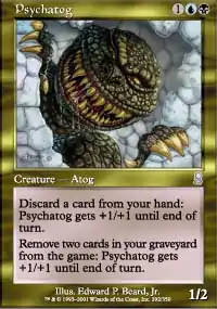 The multi-colored atogs in Odyssey were intended as hybrids of the earlier, single-color atogs. Psychatog is a hybrid of the black Necratog(from Weatherlight) and the blue Chronatog(from Visions), and this is reflected in the card's art.[10] Psychatog has a modified version of Necratog's ability to "eat" cards in the graveyard, but it was felt that Chronatog's ability, which involves skipping turns, should not be continued in Psychatog. It was initially replaced with an ability that required removing 7 cards from the player's library (deck); running out of cards means losing the game, placing a limit on how many times this ability could be used. After developer William Jockusch showed that this could be circumvented simply by using a large enough deck, the number of cards removed was increased to 10, but even this was felt to be too powerful — Battle of Wits, a card that wins the game for players with more than 200 cards in their library, was being planned for the same set, giving players more incentive to use unusually large decks. Eventually the "library-eating" ability was replaced with its current discard ability.[11]